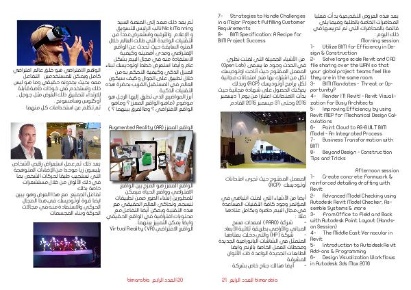 Afternoon session -1 Create concrete Formwork & reinforced detailing drafting with Revit -2 Advanced Model Checking using Autodesk Revit Model Checker, -Asemble Systems & more -3 From Office to Field and Back with Autodesk Point Layout( -Handon Session) -4 The Middle East Vernacular in Revit -5 Introduction to Autodesk Revit Add-ons & Programming -6 Design Visualization Workflows in Autodesk 3ds Max 2016 bimarabia العدد الرابع 21