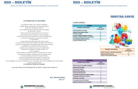 Boletín informativo interno de Biotronitech Colombia N. 01 Agosto-2013