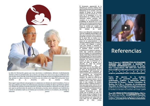 Dario P, Antonio C; ENFOQUE ÉTICO EN SITUACIONES AGRESIVAS QUE INVOLUCREN A PACIENTES Y DOCTORES DEPENDIENTES.Universidad de Brasilia. Autor correspondiente. SQS 408-C-307. 70257-030 (internet)Disponible:http://www.scielo.org.co/scielo.php?script=sci_arttext&pid=S1657-47022013000100007