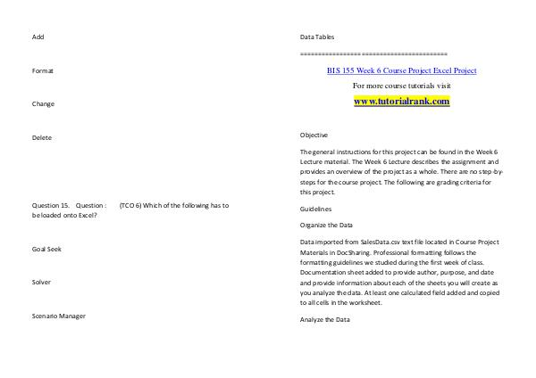 Add Format Change Delete Question 15. Question : be loaded onto Excel? Goal Seek Solver Scenario Manager (TCO 6) Which of the following has to