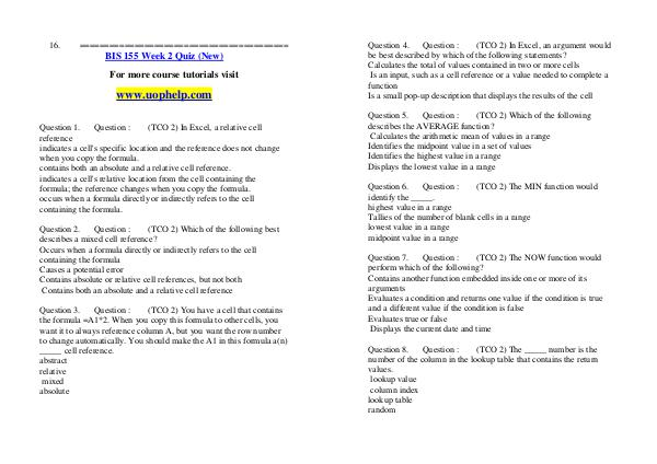 Question 4. Question:( TCO 2) In Excel, an argument would be best described by which of the following statements? Calculates the total of values contained in two or more cells Is an input, such as a cell reference or a value needed to complete a function Is a small pop-up description that displays the results of the cell