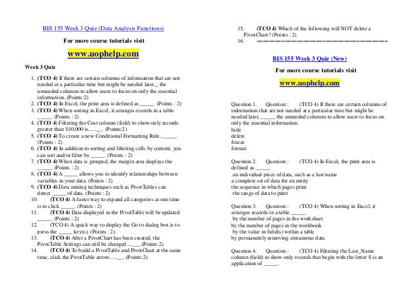 BIS 155 Week 3 Quiz( Data Analysis Functions) For more course tutorials visit www. uophelp. com