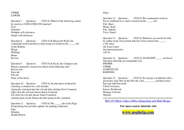 Question 15. Question:( TCO 8) To encrypt a workbook with a password, click Info on the File tab, click ________, and then select Encrypt with Password. Check for Issues Protect Workbook Manage Versions Options ================================================== BIS 155 Week 4 Quiz( Office Integration and Mail Merge)
