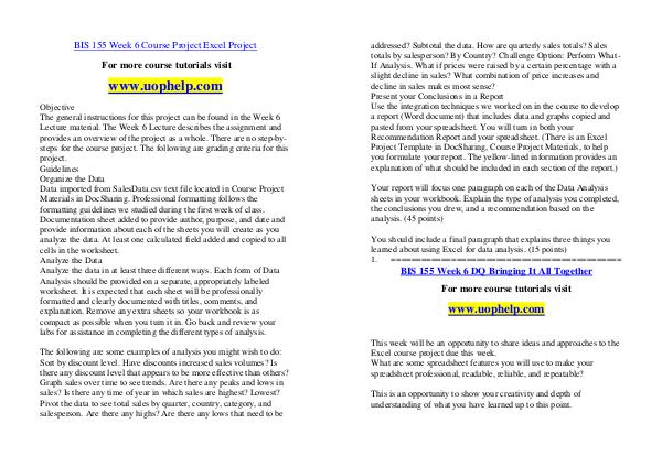 You should include a final paragraph that explains three things you learned about using Excel for data analysis.( 15 points) 1. ============================================== BIS 155 Week 6 DQ Bringing It All Together