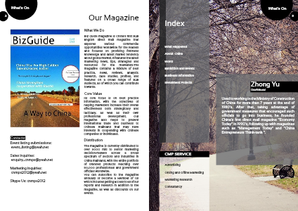 Biz Guide magazine is China's first B2B English direct mail magazine that explores various commercial opportunities worldwide for the readers and focuses on providing firsthand knowledge and latest market tendency about global market. It features the latest marketing news, tips, strategies and resources for the marketers.The magazine contains a mixture of best practice, news, reviews, analysis, research, case studies, profiles, and features on a broad range of B2B subjects, all of which you can contribute towards.