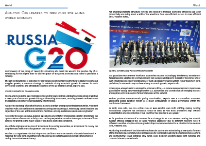 Russia, which holds the G20 rotating presidency this year, outlined a strategic agenda aimed at igniting a new cycle of economic growth through stimulating investment, boosting market confidence and transparency, and improving regulatory effectiveness.