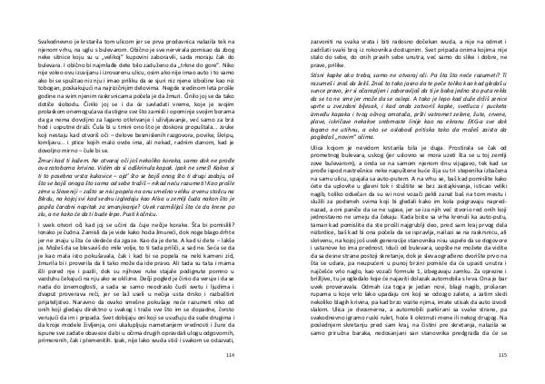 I uvek otvori oči kad joj se učini da čuje nečije korake. Šta bi pomislili? Ionako je čudna. Zamisli da je vide kako hoda žmureći, dok noge blago drhte jer ne znaju u šta će sledeće da zgaze. Kao da je dete. A kad si dete – lakše je. Možeš da se blesaviš do mile volje, to ti tada priliči, a sad ne. Seća se da je kao mala isto pokušavala, čak i kad bi se popela na neki kameni zid, žmurila bi i proverila da li tako može da ide pravo. Ali tada su tata i mama išli pored nje i pazili, dok su njihove ruke stajale podignute pomno u vazduhu čekajući na nju ako se oklizne. Dečji pogled je činio da veruje i da se nada do iznemoglosti, a sada se samo neodraslo čudi svetu i ljudima i dvaput proverava reči, jer se laž useli u nečija usta drsko i razbaštini prijateljstvo. Naravno da ovako smešne pokušaje neće razumeti niko od onih koji gledaju direktno u svakog i traže sve što im se dopadne, čvrsto verujući da im i pripada. Svet dobijaju oni koji se usuđuju da sude drugima i da kroje modele življenja, oni ukalupljuju nametanjem vrednosti i žure da ispune sve zadate obaveze da bi u očima drugih opravdali ulogu odgovornih, primerenih, čak i plemenitih. Ipak, nije lako svuda stići i svakom se odazvati,