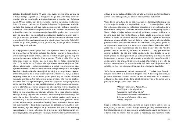 Na radiju je svirala pesma grupe koju Gale nije voleo. Nikad je nije voleo, a ne tek sad kad se forntmen pokazao kao takav i onakav u finansijskom, umetničkom i političkom smislu, akako se to nekim drugim ljudima njegove generacije naprasno razjasnilo. Glas je peveo:“ Ti nisi ti više, i što mi je najbolnije, nikom na svijetu kao meni nije, liju mi teške novembarske kiše...”. Da, može biti da Gordana više nije bila ona Gordana kojom se Gale oženio, ali njemu je- možda paradoksalno, a možda i ne, ako znamo kako izgleda sazrevanje i starenje kod muškaraca- mnogo teže padalo što njegov Saab baš bukvalno nije više bio onaj isti Saab koji je vozio godinama. Naime, prethodne jeseni Gale je imao saobraćajni udes. Udario je u njih, u Galeta i njegovog Saaba, ni krive ni dužne, pijani pevač koji se vraćao sa skupa vladajuće političke partije na kojem je pevao. Srećom, niko nije bio ozbiljno povređen. Što se svega ostalog tiče, dakako da je pevača vladajuća politička partija zaštitila. Galeta je, pak, zaštitilo njegovo uredno plaćano osiguranje. Šteta je bila totalna, ali novac koji je dobio od osiguranja nije bio dovoljan za novi automobil. I tu se Mileta iz kotlarnice pokazao kao koristan. A baš je Galeta na njega i uputio onaj odvratni Mihajlo. Taj je znao gde đavo spava, nikad ga ni zbog čega nije bilo sramota i nikad mu nije bilo dosta svega što može da se ima. Pronašao mu je, onda Mileta preko svojih veza, u inostranstvu, za neverovatno male pare isti automobil kakav je Galetu pevač uništio, a našao mu je i automehaničara koji će mu sve srediti, da novi auto vozi kao da je stari i da ga tako i registruje. Da ga legalno uveze, što je Gale prvo poželeo, nije bilo moguće jer je automobil bio prestar za domaćeg zakonodavca. I, rečeno – učinjeno. Što broj motora i broj šasije nisu bili isti, pa ko to još gleda, moj profesore! I tako je automehaničar sve funkcionalne