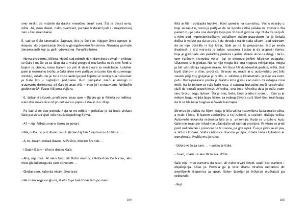 Skrenuo je u ulicu na čijem kraju je bila velika nezavršena kuća, malo ružna, a malo i lepa, ili barem zanimljiva u toj ružnoći, u svakom slučaju velika. Automehaničkarska radionica bila je u prizemlju. Kuda se ulazilo u kuću Gale nije znao, jer nikad nije ušao dalje od radnog prostora. Parkirao se pred pred radionicom i pozvonio na tri zvona, pa gde upali. Čuo je prvo lavež psa, a zatim i korake. Vrata radionice otvorila je lepa, mlada žena i ljubazno se osmehnula. Pružila mu je ruku: