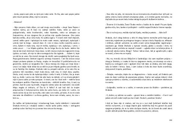 - Nije zarazno. Kaže slikar, svi sad imaju ove kredite – skupi Sava flajere i mahne njima, pa ih baci na zadnje sedište. Kaže, neko je uzeo za poljoprivredu, neko kratkoročni, neko hipoteku, neko se zakopao sa švajcarcima, al ovo njegovo što je pričao nije uopšte bezveze. Ono jeste kamata velika, ali je rata mala. Ko pakla cigara. Ti staviš neki mali depozit, uzmeš velike pare i isplaćuješ to malo svaki mesec, isplaćuješ, isplaćuješ i umreš, baš te briga- ostaviš deci. A i nisi ni decu nešto naročito zavio u crno, kažem ti mala rata, nije im teško, isplaćuju i oni, isplaćuju, i umru. I onda unuci... I za hiljadu godina, šta te briga šta će da bude. Jedino što moraš da imaš minimum troje dece. Ja bih morao malo da nagovorim moju Ljubicu za treće, ali nije to tako nemoguće ko što izgleda... Kažem ti, lepo se vidi ko je uzeo. Ne moraš mnogo da misliš, samo pogledaj šta ljudi voze. Popa garantovano. Doktori sigurno uzimaju masovno. I ovi što izvoze svoje stoput prskane jabuke za Rusiju, majku im trovačku! O političarima da ne govorimo. Jedino je nezgodno što i deca moraju da imaju po troje dece i unuci i svi dalje. Kaže slikar da se vidi ko je pre hiljadu godina uzeo kredit, to su te familije što vladaju. Doduše neki su propali načisto, al to zato što su potomci bili neozbiljni, imali malo dece, neki nisu ni imali decu uopšte. Onda, znaš, nema ko da isplaćuje dalje i onda ti neki, ti šefovi, šta ja znam koji su, dođu i uzmu sve. Mož da ode kuća na doboš, a ti sa strane gledaš i nije ti jasno zašto je neko propao. U stvari, sve ko i kod ovih – mahne Sava ka zadnjem sedištu i flaerima na kunstruku- običnih kredita. Evo, ti sad, na primer, kad bi uzeo taj kredit, mogo bi odma zube da namestiš i da vodiš Maju negde ol inkluziv, a? Šta bi ti falilo? A sad baš dal će tvojim praunucima il čukununucima neko da uzme kuću, pa neka im i uzme, ne može večno da se živi na mufte, nek rade i oni nešto, jel tako. A ne mi ovde moramo da džedžimo i za Novu godinu, žene nam mlade, same, ko zna s kim su...