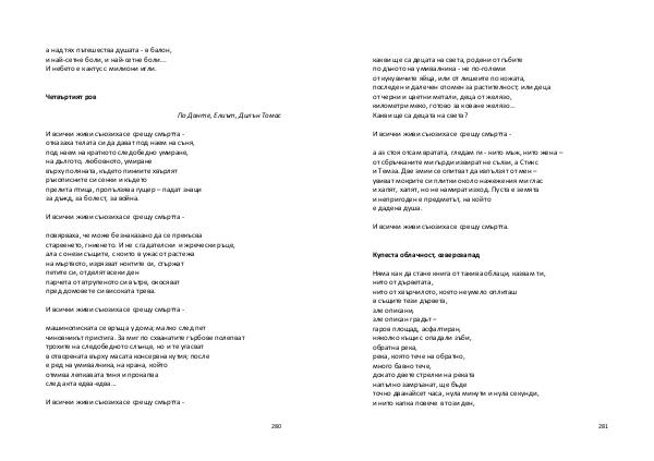 Няма как да стане книга от такива облаци, казвам ти, нито от дърветата, нито от хвърчилото, което неумело оплиташ в същите тези дървета, зле описани, зле описан градът – гаров площад, асфалтиран, няколко къщи с опадали зъби, обратна река, река, която тече на обратно, много бавно тече, докато двете стрелки на реката напълно замръзнат, ще бъде точно дванайсет часа, нула минути и нула секунди, и нито капка повече в този ден,