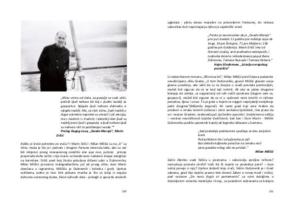 Koliko je Sreće potrebno za sreću? I Marin Držić i Milan Milišić su na „ ti“ sa Virtu; muka je što je i jednom i drugom Fortuna okrenula leđa; ako su već bili miljenici prvog renesansnog conditio sine qua non, potonji princip preporoda duha nešto i nije mario za bezobrazno nadareni dvojac alergičan na kormilare. Držić pred kraj života pokušava državni udar u Dubrovniku; Milan Milišić provocira malograđanštinu još od prvog stiha; dum Marin skončava u izgnanstvu, Milišiću je Dubrovnik i kolevka i grob. Uprkos razlikama, jedno je isto: krik pobune muzika je što se izvija iz orgulja duhovno-svetovnog dueta, likovi njihovih dela- pobegli iz apsurda smešnih