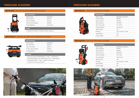 35 PRESSURE WASHERS - 120 BAR PRESSURE WASHER BEPWB1740 Specifications Motor Type Brushless Induction Power Rating 1500W Max Pressure 120 Bar Max Pressure 1740 PSI Max Flow Rate 5.3 It / min Pump Material Aluminium Self-Priming Yes Nozzles Fan to Pencil , Turbo Soap Bottle Yes Hose Length 6m Specifications Motor Type Brushless Induction Power Rating 2100W Max Pressure 165 Bar Max Pressure 2393 PSI Max Flow Rate 6.7 It / min Pump Material Aluminium Self-Priming Yes Nozzles Fan to Pencil , Turbo Soap Bottle Yes Hose Length 8m - 165 BAR PRESSURE WASHER BEPWB2400