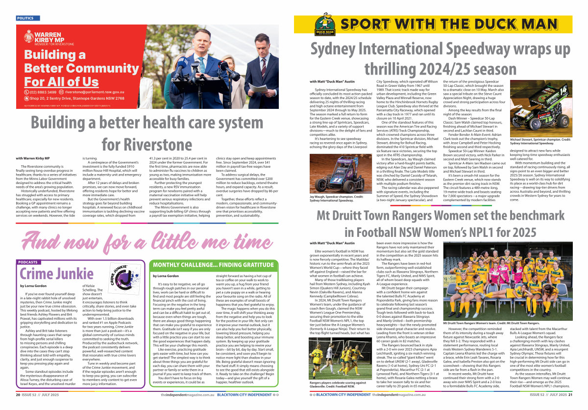 City Speedway, which operated off Wilson Road in Green Valley from 1967 until 1989. That iconic track made way for urban development, including the Green Valley Plaza and Winnall Reserve, now home to the Hinchinbrook Hornets Rugby League Club. Speedway also thrived at the Parramatta City Raceway, which opened with a clay track in 1977 and ran until its closure on 10 April 2021.