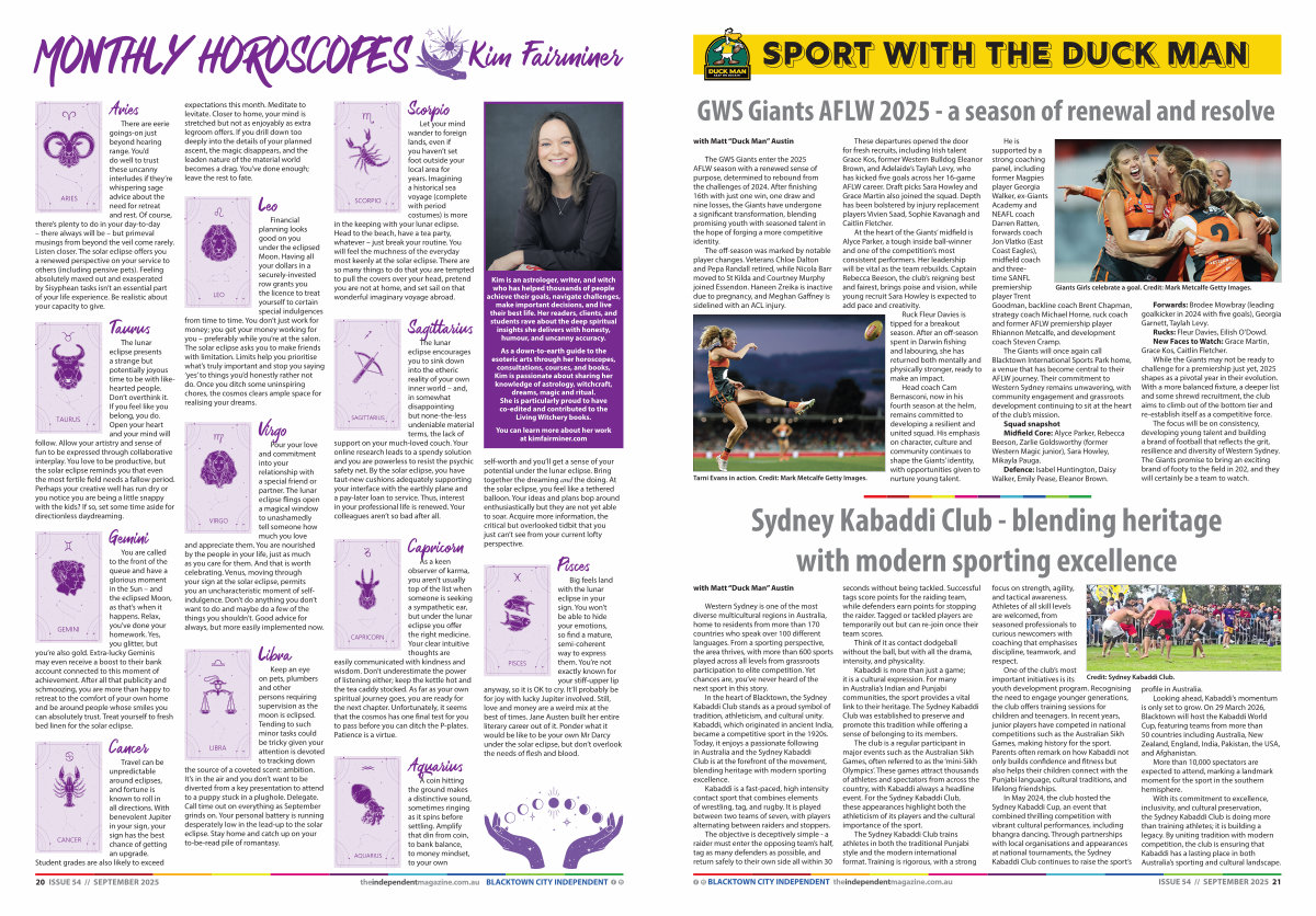 Libra Keep an eye on pets, plumbers and other persons requiring supervision as the moon is eclipsed. Tending to such minor tasks could be tricky given your attention is devoted to tracking down the source of a coveted scent: ambition. It’ s in the air and you don’ t want to be diverted from a key presentation to attend to a puppy stuck in a plughole. Delegate. Call time out on everything as September grinds on. Your personal battery is running desperately low in the lead-up to the solar eclipse. Stay home and catch up on your to-be-read pile of romantasy.