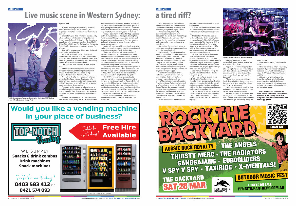 Blacktown Council’ s Curator of Performance, Veronica Barac-Gomez, acknowledges that music is often a secondary element at council-run events. The most recent example was the“ Blacktown Garage Party”, held last month as a farewell event for the Leo Kelly Arts Centre. The two-day program included design and arts workshops, photography, face painting and four music sets on the second day. This month, Council will host“ Summer Music at Elara Food Market” on February 14.
