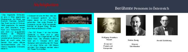 Berühmte Personen in Österreich Wolfgang Amadeus Mozart Er war ein Pianist und Komponist. Stefan Zweig War ein Schriftsteller. Arnold Schönberg