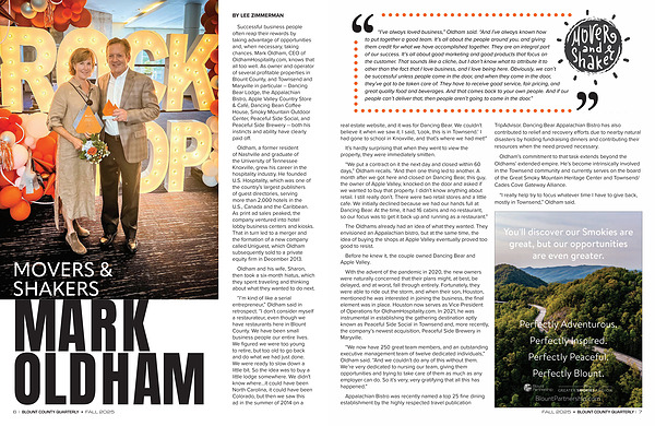 Successful business people often reap their rewards by taking advantage of opportunities and, when necessary, taking chances. Mark Oldham, CEO of OldhamHospitality. com, knows that all too well. As owner and operator of several profitable properties in Blount County, and Townsend and Maryville in particular-- Dancing Bear Lodge, the Appalachian Bistro, Apple Valley Country Store & Café, Dancing Bean Coffee House, Smoky Mountain Outdoor Center, Peaceful Side Social, and Peaceful Side Brewery-- both his instincts and ability have clearly paid off.