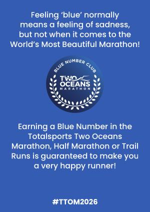 Earning a Blue Number in the Totalsports Two Oceans Marathon, Half Marathon or Trail Runs is guaranteed to make you a very happy runner!