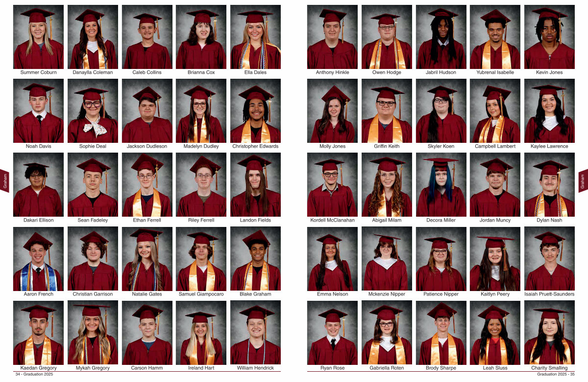 Graduation 2025- 35 Graham Kevin Jones Yubrenal Isabelle Jabril Hudson Owen Hodge Anthony Hinkle Kaylee Lawrence Campbell Lambert Skyler Koen Griffin Keith Molly Jones Dylan Nash Jordan Muncy Decora Miller Abigail Milam Kordell McClanahan Isaiah Pruett-Saunders Kaitlyn Peery Patience Nipper Mckenzie Nipper Emma Nelson Charity Smalling Leah Sluss Brody Sharpe Gabriella Roten Ryan Rose