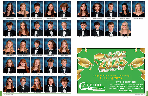 70- Graduation 2025 Narrows Hanna Smith James Rose Nathan Robertson Braylee Robertson Emily Prescott David Taylor II Bram Tabor Isabella Spicer Taylor Sowers Kaden Snider Aiden Tiller Nicholas Thompson Kiva Thompson Brent Thompson Maygan Tebbe Braden Poe Hunter Owens Gavin Nixon Jaden Neice Cameron Mullins Ean Mertz Isabelle Merrix Andrew Meredith Madison McCroskey Shyane Martin