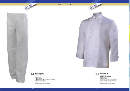 Art.CHEF 20 Pantalone bianco Tessuto 100% cotone Peso 220 g/mq 2 tasche a profilo 1 tasca posteriore lato dx chiusura con bottone Elastico in vita con laccio Taglie: S – M – L – XL - XXL Conf.da 30 pezzi Min.ord. 1 pezzo 103