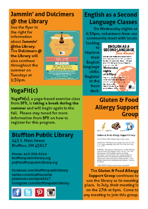 See the flyer to the right for information about Jammin' @the Library. The Dulcimers @ the Library will also continue throughout the summer on Tuesdays at 1:30pm.
