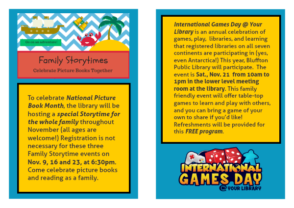 To celebrate National Picture Book Month, the library will be hosting a special Storytime for the whole family throughout November (all ages are welcome!) Registration is not necessary for these three Family Storytime events on Nov. 9, 16 and 23, at 6:30pm. Come celebrate picture books and reading as a family.