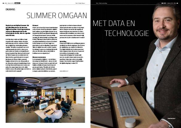 Mensen meenemen De technologieën in DigiBase – een dochteronderneming van VolkerWessels – zijn an sich niet nieuw voor de bouw. De brede aanpak is dat wel. DigiBase wil digitaal bouwen honderd procent gemeengoed maken.“ We willen dat het hele peloton digitaal aanhaakt. Directieleden, projectmanagers, projectontwikkelaars, aannemers, projectpartners en klanten kunnen allemaal slimmer gebruik maken van data en technologie. Andere manieren van werken zijn mogelijk, we kunnen bedrijfsprocessen innoveren en nieuwe verdienmodellen ontwikkelen, maar daar moet je mensen wel in meenemen. Iedere innovatie krijgt past waarde als je die schaalbaar weet te maken.”