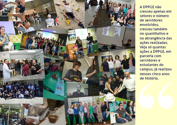 A DPPGE não cresceu apenas em setores e número de servidores envolvidos, cresceu também no quantitativo e na abrangência das ações realizadas. Veja só quantas ações a DPPGE, em parceria com servidores e estudantes do campus, já realizou nesses cinco anos de história.