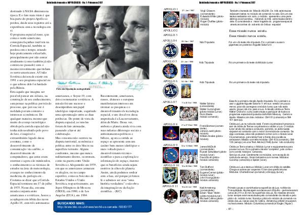 destinado à NASA diminuiu na época. E o fato mais triste é que boa parte do projeto Apollo se perdeu, desde seus registros até a experiência com a tecnologia em si. O programa espacial russo, que como o norteamericano, conseguiu façanhas incríveis na Corrida Espacial, também se perdeu com o tempo, estando hoje praticamente esfacelado, principalmente por não contar atualmente( como também já não contava no passado) com o mesmo investimento que tinham os norteamericanos. A União Soviética deixou de existir em 1991 e seu programa espacial ou o que sobrou dele foi herdado pela Rússia. Erra aquele que imagina ser possível pensar em ciência, na construção de seu conhecimento, sem pensar na política por trás do processo, que por sua vez é moldada por um contexto e interesses econômicos. De qualquer maneira, mesmo que muito do avanço tecnológico obtido pela corrida espacial não tenha sido usufruído pelo povo de fato, é inegável o extraordinário legado dessa aventura, como o desenvolvimento de comunicação via satélite, o desenvolvimento de computadores, que antes eram enormes e agora são minúsculos, o conhecimento e as técnicas de estudos na área de meteorologia, avanços no conhecimento da medicina, da geologia etc... Costumase dizer que a Corrida Espacial terminou em 17 de julho de 1975. Nesse dia, em uma missão conjunta entre americanos e soviéticos, houve a acoplagem em órbita das naves Apollo 18, com três astronautas