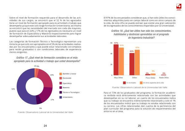 Para el 73 % de los graduados del programa , la formación académica recibida está directamente relacionada con las actividades que desempeñan en su rol laboral , un cuarto de los encuestados indica que su trabajo se encuentra indirectamente relacionado y solo el 1 % de los encuestados indicó que su trabajo no estaba relacionado con su carrera . Las cifras relacionadas dan cuenta de la pertinencia del plan curricular del programa para la solución de requerimientos del entorno en el área .
