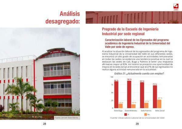 Al analizar la situación laboral de los egresados del programa de Ingeniería Industrial de la Universidad del Valle en sus diferentes sedes , se encontró un alto grado de ocupación en actividades remuneradas en todas las sedes ; se evidencia una tendencia positiva en la cual se destacan las sedes de Cali , Buga y Palmira al tener una respuesta afirmativa mayor al 83 %. Así mismo se presenta una oportunidad de mejora en la sede Zarzal al encontrar que el 27 % de sus egresados no realiza alguna actividad remunerada en la actualidad .