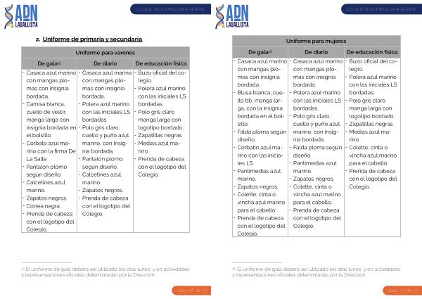 De gala 16 De diario De educación física - Casaca azul marino con mangas plomas con insignia bordada . - Blusa blanca , cuello bb , manga larga , con la insignia bordada en el bolsillo . - Falda ploma según