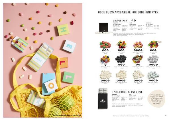 Holdbarhet ca. 12 måneder. Sukkertøy ca. 200 biter per kilo. Vingummi ca. 240 biter per kilo. Chewies ca. 340 biter per kilo. Bestilles i jevne antall på 5 kg. Pakkes for transport i pappesker på 5 kg. Fleksotrykk i 1 – 4 PMS-farger. Fast plassering av logo, maksimal størrelse ca. 17x35 mm.