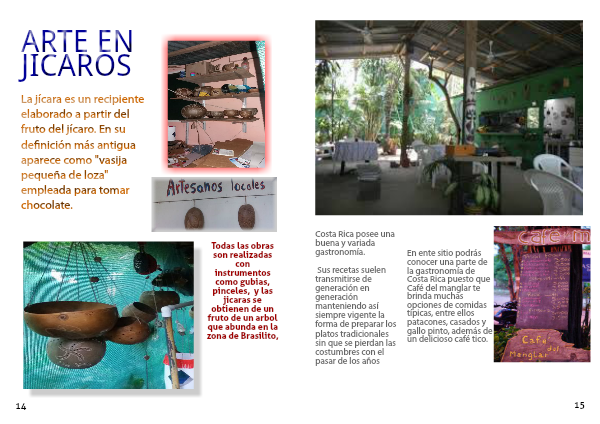 Todas las obras son realizadas con instrumentos como gubias, pinceles, y las jicaras se obtienen de un fruto de un arbol que abunda en la zona de Brasilito,
