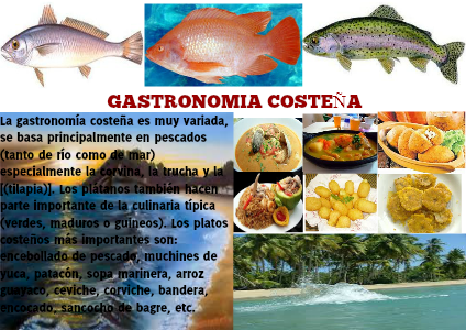 La gastronomía costeña es muy variada, se basa principalmente en pescados (tanto de río como de mar) especialmente la corvina, la trucha y la [(tilapia)]. Los plátanos también hacen parte importante de la culinaria típica (verdes, maduros o guineos). Los platos costeños más importantes son: encebollado de pescado, muchines de yuca, patacón, sopa marinera, arroz guayaco, ceviche, corviche, bandera, encocado, sancocho de bagre, etc.