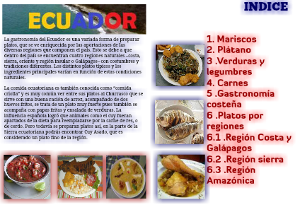 La gastronomía del Ecuador es una variada forma de preparar platos, que se ve enriquecida por las aportaciones de las diversas regiones que componen el país. Esto se debe a que dentro del país se encuentran cuatro regiones naturales –costa, sierra, oriente y región insular o Galápagos– con costumbres y tradiciones diferentes. Los distintos platos típicos y los ingredientes principales varían en función de estas condiciones naturales.