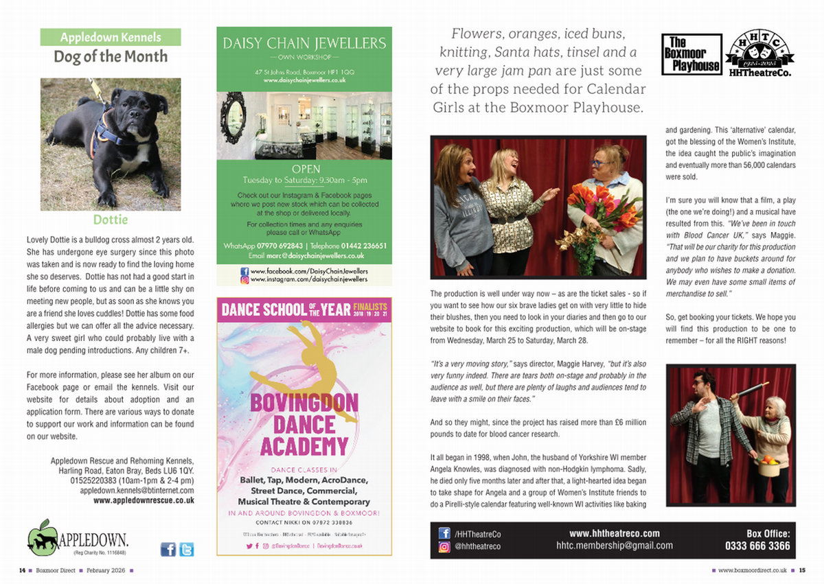 Flowers, oranges, iced buns, knitting, Santa hats, tinsel and a very large jam pan are just some of the props needed for Calendar Girls at the Boxmoor Playhouse.