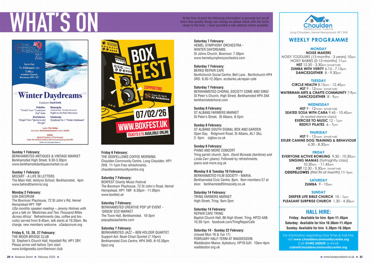Saturday 7 February: BOXFEST Charity Music Festival The Boxmoor Playhouse, 72 St John ' s Road, Hemel Hempstead, HP1 1NP. 6.30pm- 11.00pm www. boxfest. uk