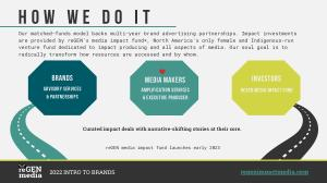 Our matched-funds model backs multi-year brand advertising partnerships . Impact investments are provided by reGEN ' s media impact fund *, North America ' s only female and Indigenous-run venture fund dedicated to impact producing and all aspects of media . Our soul goal is to radically transform how resources are accessed and by whom .