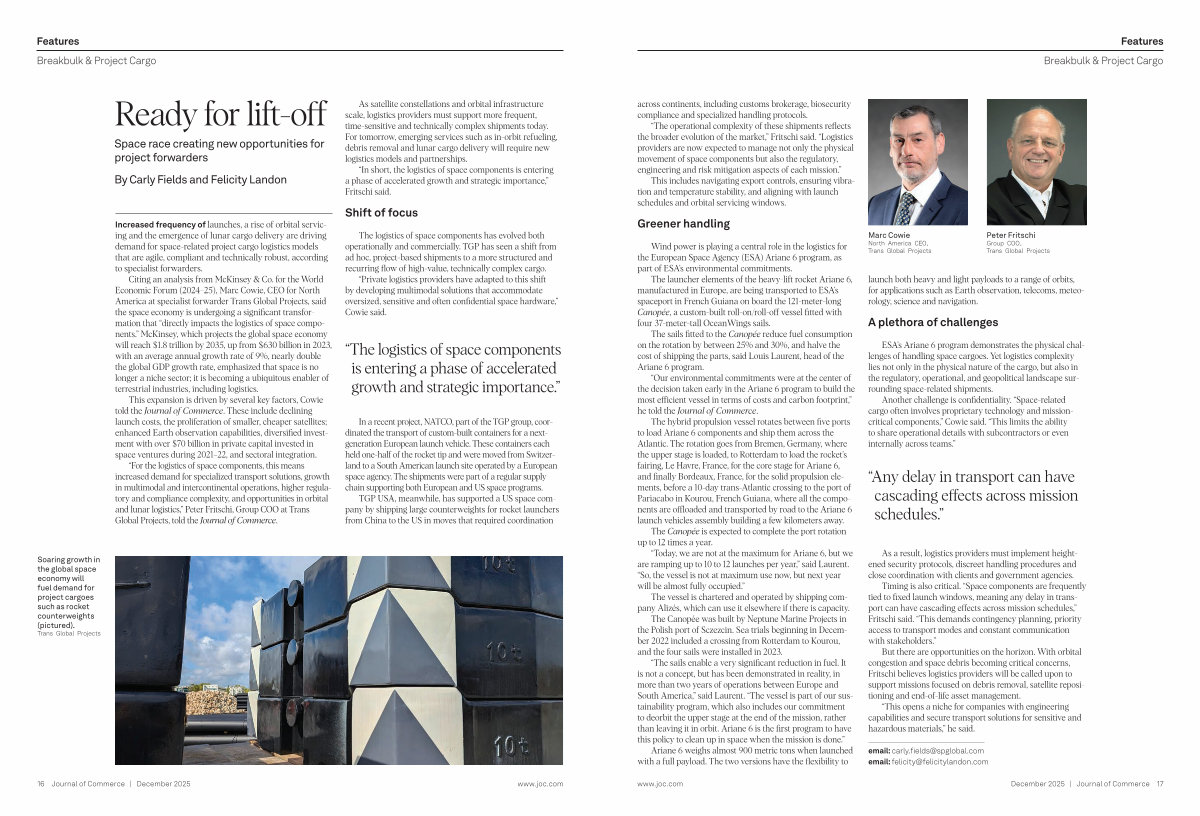 “ For the logistics of space components, this means increased demand for specialized transport solutions, growth in multimodal and intercontinental operations, higher regulatory and compliance complexity, and opportunities in orbital and lunar logistics,” Peter Fritschi, Group COO at Trans Global Projects, told the Journal of Commerce.