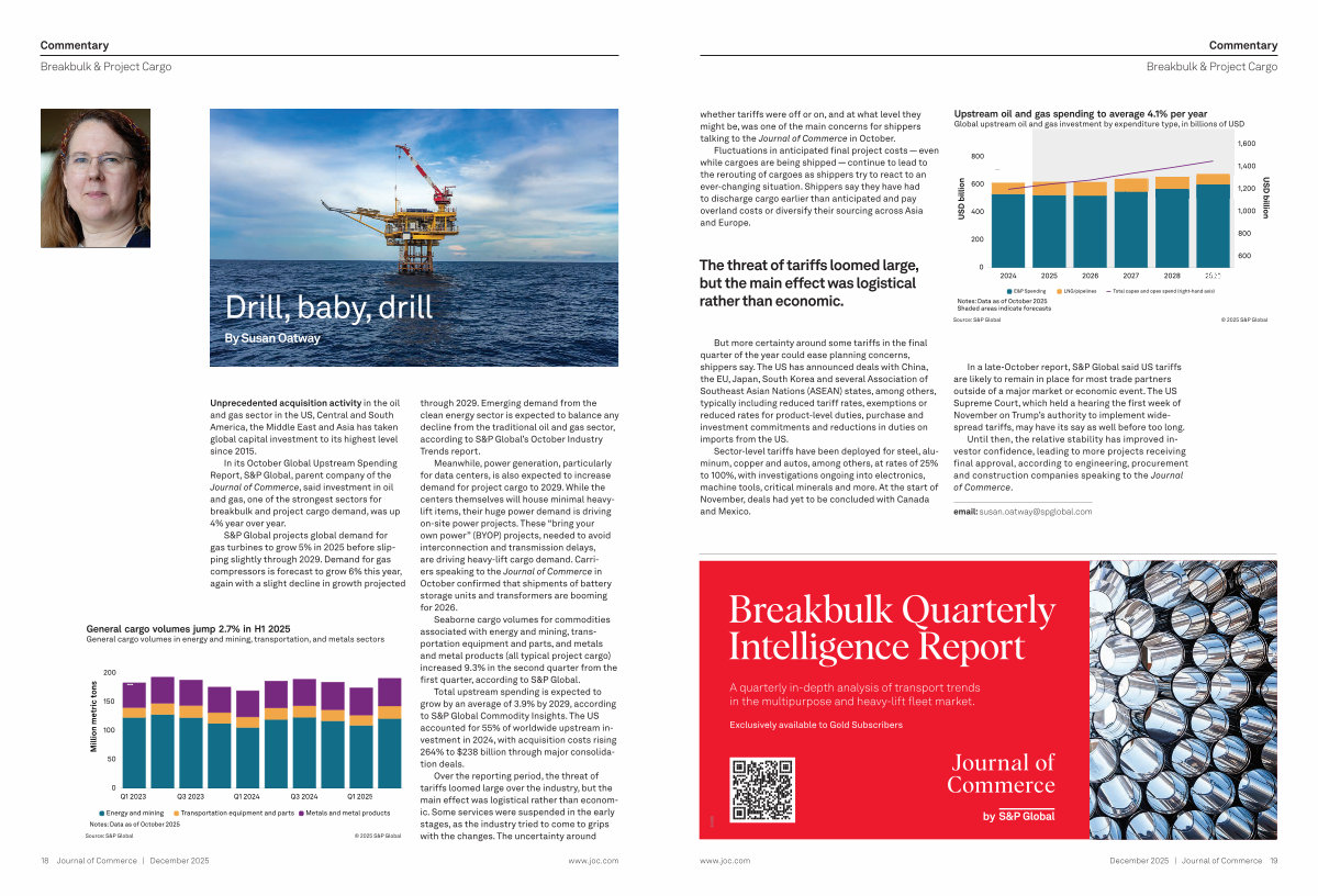 In its October Global Upstream Spending Report, S & P Global, parent company of the Journal of Commerce, said investment in oil and gas, one of the strongest sectors for breakbulk and project cargo demand, was up 4 % year over year.