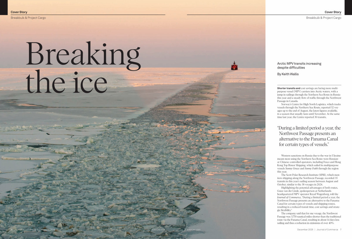 The company said that for one voyage, the Northwest Passage was 3,750 nautical miles shorter than the traditional route via the Panama Canal, resulting in about 14 days less sailing and thus a reduction in emissions of over 40 %. www. joc. com December 2025 | Journal of Commerce 7