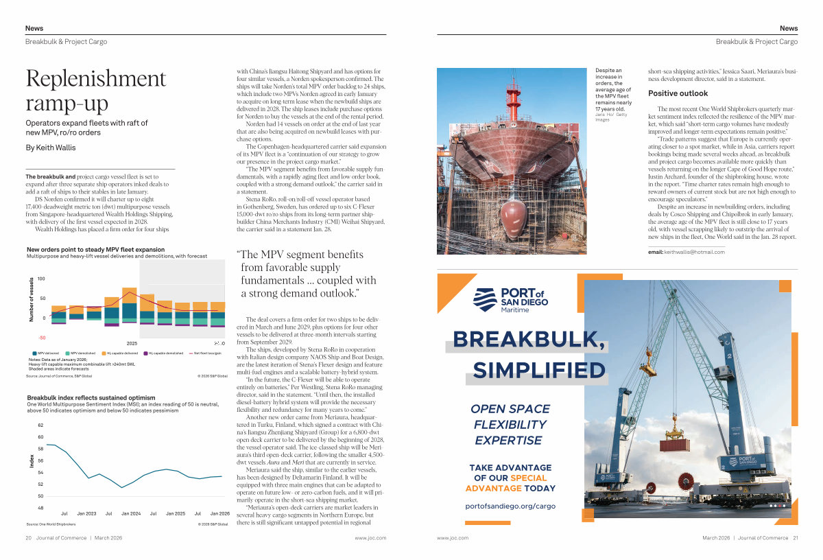 Wealth Holdings has placed a firm order for four ships with China’ s Jiangsu Haitong Shipyard and has options for four similar vessels, a Norden spokesperson confirmed. The ships will take Norden’ s total MPV order backlog to 24 ships, which include two MPVs Norden agreed in early January to acquire on long-term lease when the newbuild ships are delivered in 2028. The ship leases include purchase options for Norden to buy the vessels at the end of the rental period.