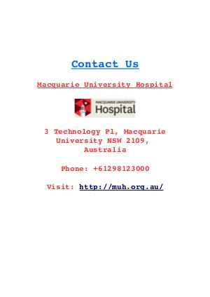 Contact Us Macquarie University Hospital 3 Technology Pl, Macquarie University NSW 2109, Australia Phone: +61298123000 Visit: http://muh.org.au/