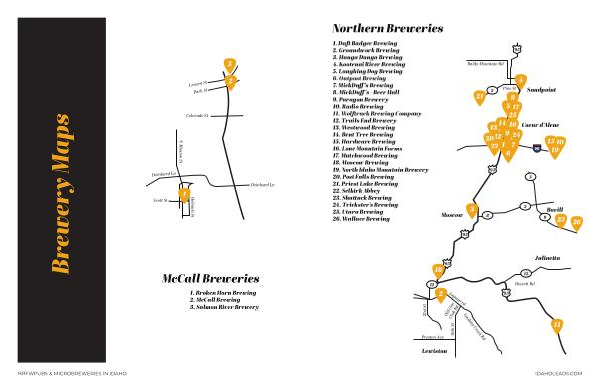 1 . Daft Badger Brewing 2 . Groundwork Brewing 3 . Hunga Dunga Brewing 4 . Kootenai River Brewing 5 . Laughing Dog Brewing 6 . Outpost Brewing 7 . MickDuff ’ s Brewing 8 . MickDuff ’ s - Beer Hall 9 . Paragon Brewery 10 . Radio Brewing 11 . Wolftrack Brewing Company 12 . Trails End Brewery 13 . Westwood Brewing 14 . Bent Tree Brewing 15 . Hardware Brewing 16 . Lone Mountain Farms 17 . Matchwood Brewing 18 . Moscow Brewing 19 . North Idaho Mountain Brewery 20 . Post Falls Brewing 21 . Priest Lake Brewing 22 . Selkirk Abbey 23 . Shattuck Brewing 24 . Trickster ’ s Brewing 25 . Utara Brewing 26 . Wallace Brewing |