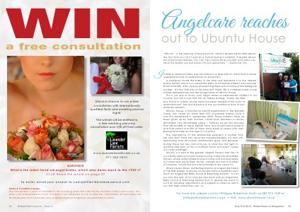 Terms & Conditions apply The competition is open to all brides in the Gauteng area and valid for the duration of the current issue. The prize is not redeemable for cash. The bride is not obligated to use us after the consultation. All rights reserved. No Employees from Lavender Lane or Brides Essence magazine are permitted to enter. 32 Brides Essence.com - Issue 9