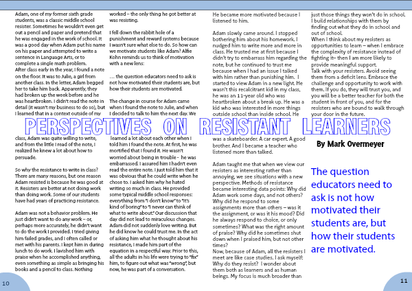 Now, because of Adam, all the resisters I meet are like case studies. I ask myself: Why do they resist? I wonder about them both as learners and as human beings. My focus is much broader than just those things they won’t do in school. I build relationships with them by finding out what they do in school and out of school.