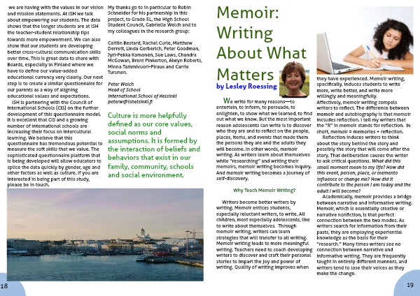 we are having with the values in our vision and mission statements. At ISH we talk about empowering our students. The data shows that the longer students are at ISH the teacher-student relationship tips towards more empowerment. We can also show that our students are developing better cross-cultural communication skills over time. This is great data to share with Boards, especially in Finland where we have to define our value-added educational currency very clearly. Our next step is to create a similar questionnaire for our parents as a way of aligning educational values and expectations.